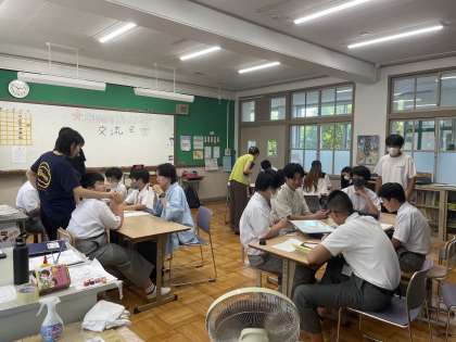 お互いに自己紹介をしあった後、飯盒炊飯のメニュー、キャンプファイヤーでの出し物について話し合いました。本校の生徒は、司会を務めて話し合いを進行し、いろいろな意見が出る中で、飯盒炊爨のメニューは「カレーライス」出し物が「〇×ゲーム」に決定しました。