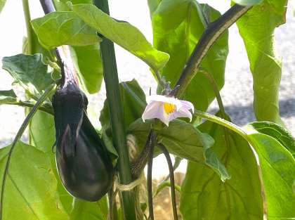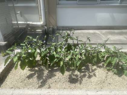 5・6組が栽培しているナスが順調に育っています。薄紫色の花を咲かせて実をつけています。収穫が楽しみです。