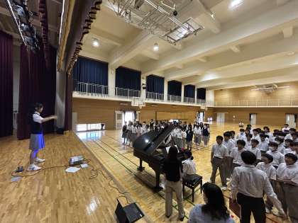 1年生の学年集会では、代表生徒からの各クラスの1学期の振り返りと先生方からのお話がありました。最後に学年合唱で「We'll Find The Way」を歌いました。
