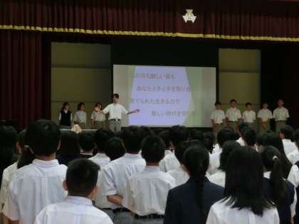 始業式の中で全校生徒で歌う校歌と安祥寺中学校記念応援ソングの「step by step」は、「2学期に行われるたくさんの行事をみんなで頑張って取り組んでいこう」という思いを込めて歌いました。