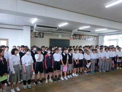 1年生でも、初めての中学校の合唱コンクールに向けて、練習に気合いを入れて取り組んでいます。今日は音楽室に学年全員が集まって、学年合唱の「We'll Find The Way」を歌いました。元気な歌声にこれから本番までにどれだけ伸びるか楽しみです。