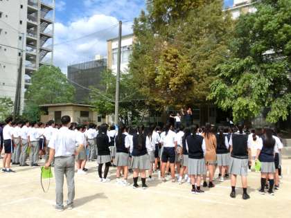 2年生では、学年合唱で歌う「14〜fourteen〜」をグラウンドに学年全員で集まって練習をしました。久しぶりの練習でしたが、2年生のやる気が十分伝わる歌声が、秋の気配が感じられるようになったグラウンドに響き渡りました。