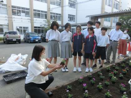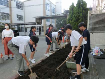 本日の前期最終の評議・各種委員会で、美化保健委員会は中庭の花壇の整備を行いました。花屋さんを講師にお迎えし、花壇の土つくりや花の植え方を教わりながら作業を進めました。