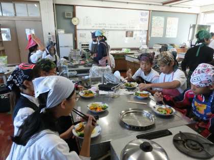メニューは、「さけのムニエルと蒸し野菜のサラダ」です。本日実施の2クラスも、班のメンバーと協力して、安全に留意しながら効率よく作業を進めることができました。この経験を活かして、家庭でも家族のために作ってくださいね。