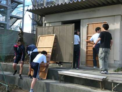 明日10月16日(木)の体育大会は、天候不良のため17日(金)に延期になりましたが、明日の前日準備が天候の影響でできない可能性が高いので、17日(金)に向けてのできる範囲での準備を、本日放課後、委員会の生徒で行いました。