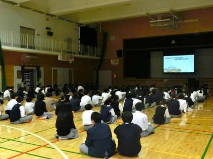 今日はその第1回目の時間で、体育館に学年全員が集まり、オリエンテーションとして学年主任の先生のお話を聞きました。その後、各教室に戻って「山科の魅力」について考えました。