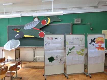 3年生の総合的な学習の時間では、修学旅行の平和学習、学校祭文化の部の学年劇で使用した大道具を展示しています。