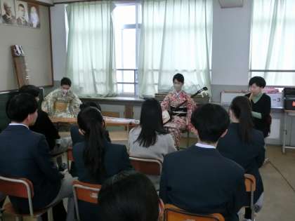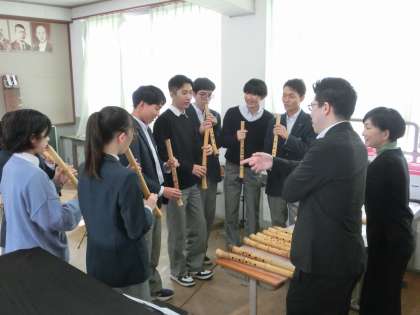 講師の方の「春の海」「六段の調」の演奏を聴いた後、生徒たちは「琴」と「尺八」の体験を行いました。「琴」と「尺八」の音色と奏法を体感し、日本の伝統音楽に親しむ貴重な時間となりました。