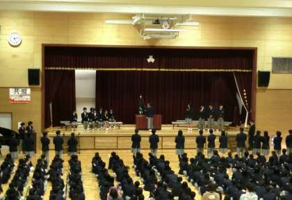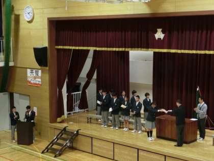 現生徒会本部の最後の仕事となる後期の認証式が11月10日(月)6限に行われました。現生徒会副会長の司会で始まった式は、校長先生から新生徒会本部役員が認証されると、司会を新しい副会長にバトンタッチしました。