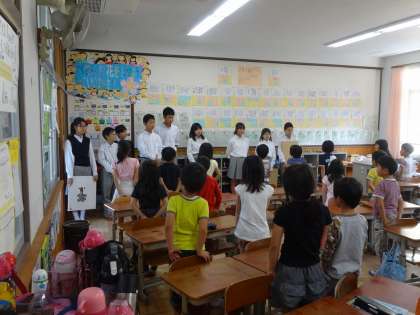 文化図書委員会の生徒たちが校区内の3小学校を訪問し、小学1・2年生に大きな絵本や紙芝居の読み聞かせを行いました。練習の成果を発揮して大きな声でハキハキと読み上げ、小さな児童たちはまさにお話に釘づけといった様子でした。お兄さん・お姉さんとしてすばらしい活躍をしてくれました。