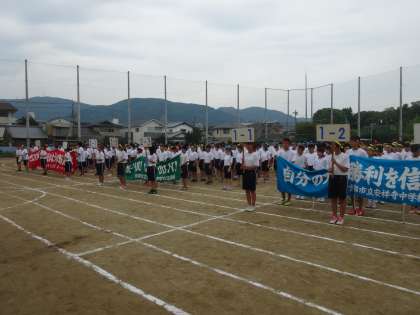 写真は「入場行進」・「選手宣誓」・「3年女子100m走」の様子です。生徒たちには力一杯競技してほしいと思います。また、生徒たちのやる気で雨雲を吹き飛ばし、最後まで競技ができることを願っています。