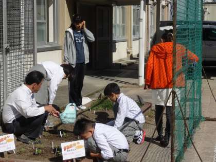 技術の栽培学習では夏休みあけに収穫したとうもろこしに続き冬に旬を迎える野菜を種から栽培しています。おでんの具材としても人気がありますがわかるでしょうか?