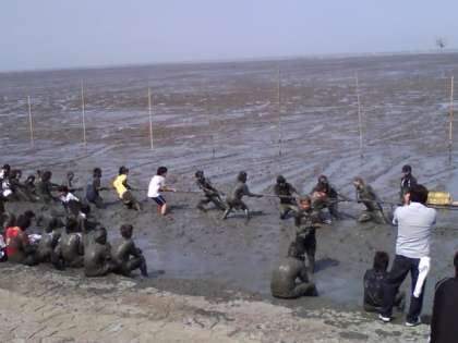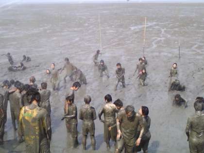 (上)全員参加「海上綱引き」こけてしまって,みんな泥だらけ!