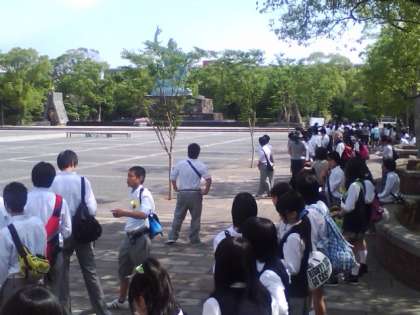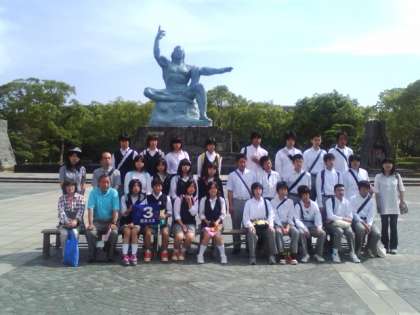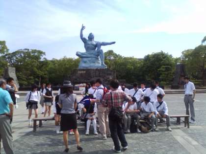 予定より20分早くバスで出発。平和公園の「平和祈念像」の前でクラス写真を撮り,原爆資料館へ向かいます。1945年8月9日の原爆被害の実態と同時に核兵器のない世界をめざす人々の取組をしっかり学習します。