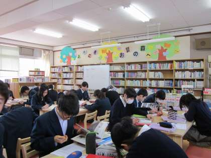 2年生の国語の授業では自分が興味あることに関して「事実」を調べ、その根拠のもとに意見文を書くという学習をしています。戦争や環境破壊がなぜなくならないのかという社会的な問題や石や漢字の魅力など様々なテーマを選んでいます。