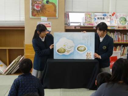 3/12(土)、3年生の女子生徒有志が山科図書館で絵本の読み聞かせを行いました。中学校の委員会活動等での経験を生かし、地域の幼児のためにボランティア活動を行いました。じっと聞き入る小さな観客の姿を前にした本校生徒たちの姿は輝いていました。