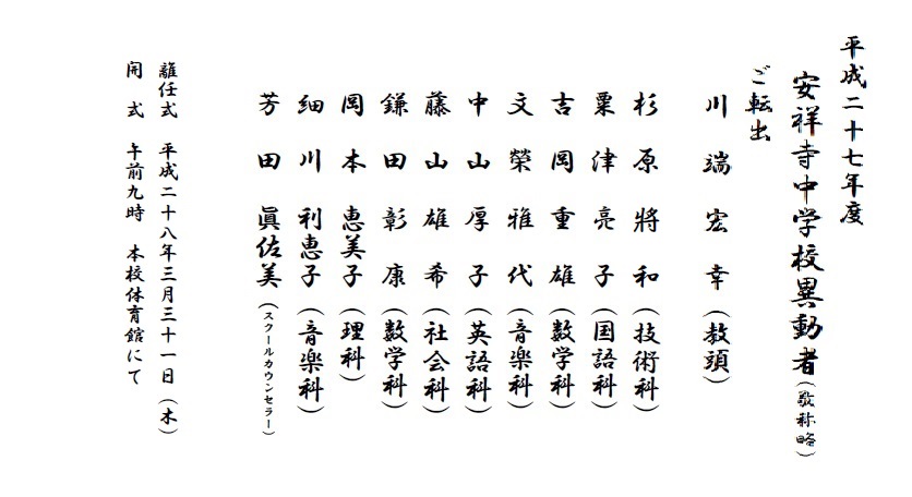 春の訪れとともに、お別れの季節がやってきました。今年もお世話になった先生方が離任されます。詳しくは下の「ここをクリック」をクリックして、「配布文書」をご覧ください。なお、離任式は3月31日(木)9:00より本校体育館で行います。