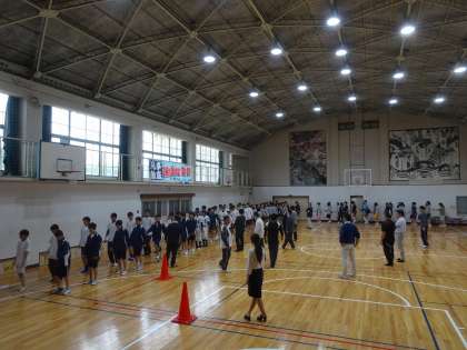 いよいよ明日から春季総合体育大会がスタートします。西京極運動公園にて行われる1万人規模の開会式に向けて、各部の代表生徒が行進練習を行いました。あいにくの雨のため体育館での練習となりましたが、明日の本番では試合と同じように一発勝負で力強い行進をしてほしいと思います。