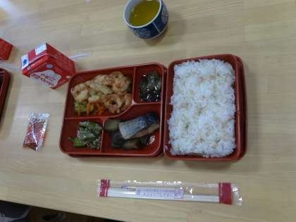 給食試食会の後半は実食。今日は和(なごみ)メニューで京都産の万願寺とうがらしの味噌いため、京都産きゅうりのもずく酢、鰊なす、かき揚げ天丼でした。