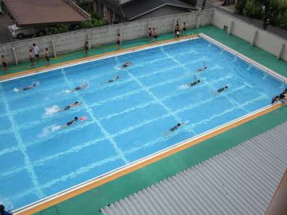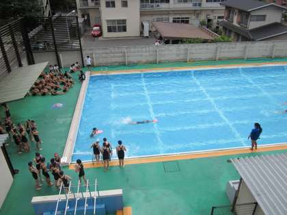 先週はあまりつけないでしのいだ教室のエアコンですが,今日はさすがに1限から稼働しないわけにはいかない状況です。写真は先週から始まっている「水泳」の授業。1年生の様子です。