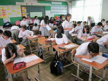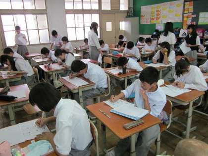 7月1日(金)にご紹介しました1年3組研究授業の続き(次時)にあたる授業です。「(生徒の作品である)続編を読み味わい,なるほどと思うことを引用したり,コメントしよう」という時間です。互いの作品を静かに読み合っていました。途中「6個のコメント欄を大事に使ってや」と指示が出されていました。。人の意見を読み取ったり,参考にしたりする中で,『深い学び』の実現をめざします。