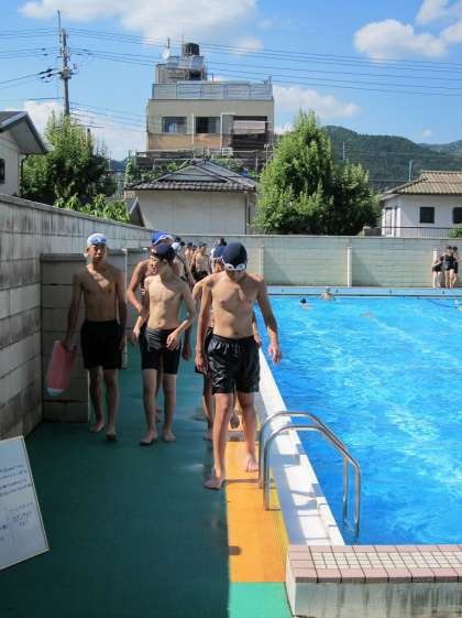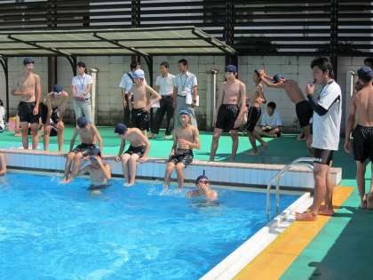 6限に保健体育科の研究授業が実施されました。平泳ぎのフォームの改善をねらいとした授業でした。ペアを組んで,手の動きや脚の動きについて観察し,アドバイスしていきます。プールサイドをたどってスタートに戻る場面が大切なアドバイスの時間となっていました。洛北中,桂川中,洛南中,衣笠中の保健体育科の先生方が参観し協議が行われました。この後,西陵中学校の先生が協議に加わっています。