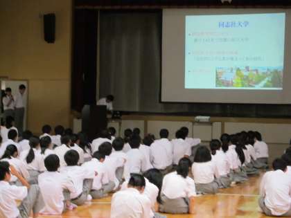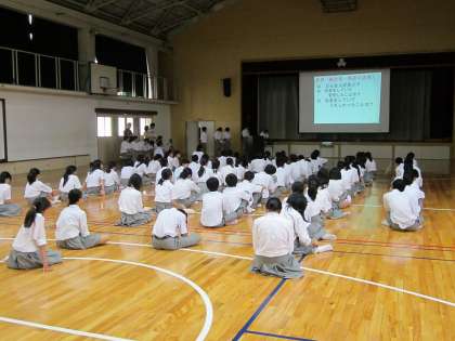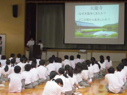 5月30日の校外学習における取材とその後の考察結果についてのまとめを交流する学年集会が行われました。クラスごとの発表会で選ばれた1班ずつ,3つの班の発表を学年全体で共有する機会です。京都の寺社や大学でのインタビュー結果を素材として,京都の街の魅力を探ろうとする取組でした。