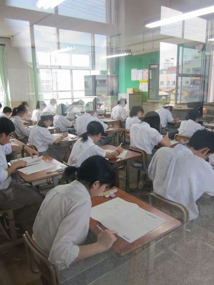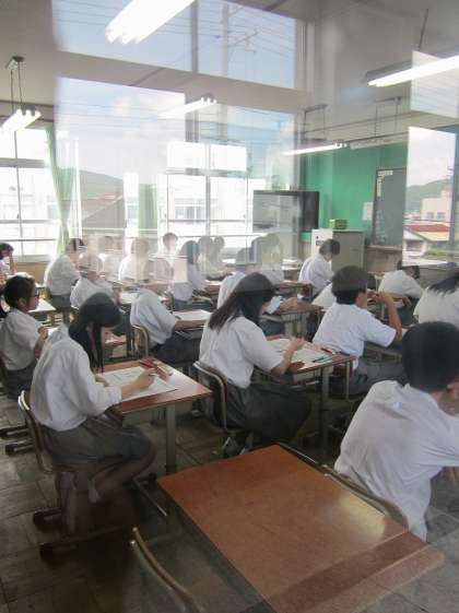 学習確認プログラム Pre-Stage1(2年生)の確認テストです。今日は1限から5限まで,国・社・数・理・英の問題に取り組みます。社会,数学,理科については1年生の学習内容です。国語,英語は2年生の学習内容も含まれています。