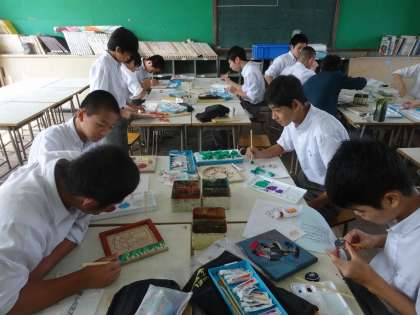 3年生の美術の授業では木製パズルを制作しています。遊び手の楽しみを考え、パズルの下、木枠の部分にも関連ある絵を配するなどそれぞれに工夫をしています。