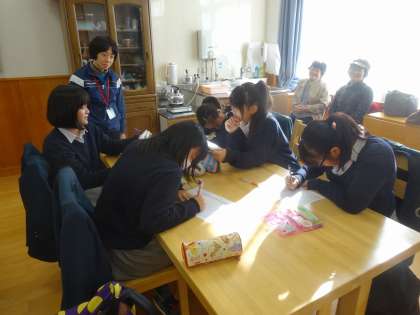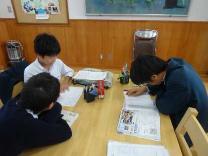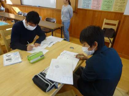 集中して取り組んでいる生徒、友だちのがんばりをふと見ている生徒、友だちと相談しながら進めている生徒と、場面によって変化があることも家庭での学習とはまた違い、気分転換をしながら学習を進めています。