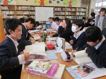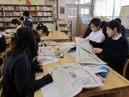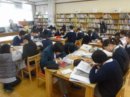 今日は学級ごとに図書館で1時間,一人一人が選んだ社説(テーマ)について調べる時間です。来週からは各自でテーマについて新聞にまとめる作業に入ります。