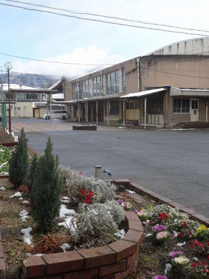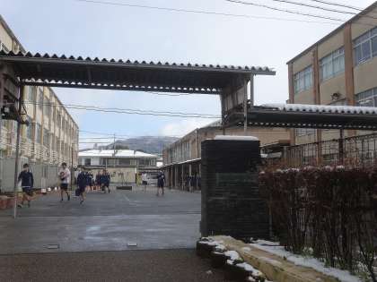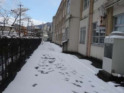 この冬一番の寒波ということでまだ雪が舞っています。校内ではわたり廊下や体育館の屋根と北校舎北側以外、地表の雪は融けています。グランドが使用できないため、本日の避難訓練は教室での防災学習に変更します。
