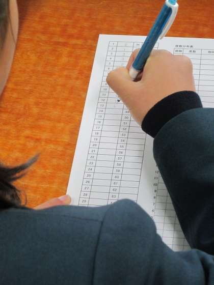 クラス全員で2回ずつ実験を行い,結果をすべて集計し,度数分布表にまとめてヒストグラムを作成することで傾向をとらえます。