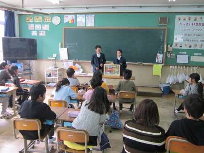 西野小学校へは,1年1組,1年2組,2年2組,2年3組の委員が出向きました。3年生と4年生に「21歳のユリカモメ〜山科川で観察」「山科本願寺 土塁物語」「山科 花山稲荷のお火焚祭と名刀小狐丸の伝説」の三作品をお届けし,内容についてのクイズに答えてもらいました。盛り上がったようです。