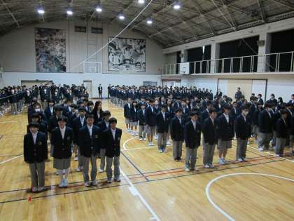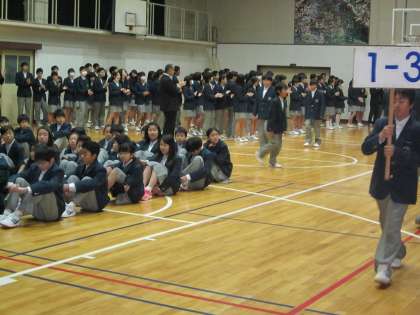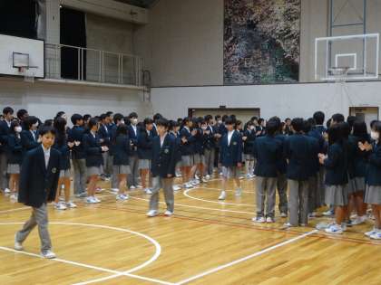 在校生の拍手に迎えられて,1年生が入場します。入学式から三日目,全学年が一堂に会する初めての機会です。