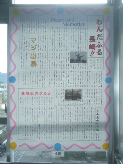 3年生の壁新聞「修学旅行三県」では、修学旅行で訪れた佐賀・福岡・長崎の三県を1組から4組のそれぞれが担当して壁新聞を作成しました。会場にお越しの方々(生徒・保護者とも)に各県の作品で最も良かったものを選んで投票をしていただきました。