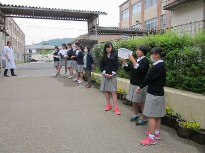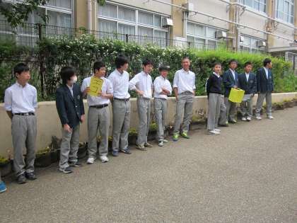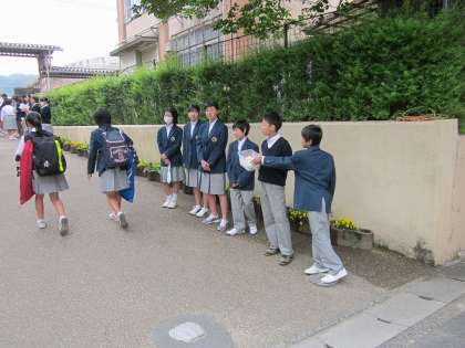 生徒会本部と学級委員長がおはようの声かけをしています。校門前を通られる方にもあいさつができていました。エコキャップ回収もあわせて声かけ。
