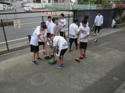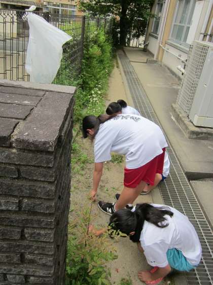 女子バスケットボールは今日は雑草とり。男子バスケットボール部は北校舎北側の掃き掃除。