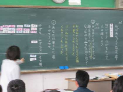 資料「おばあちゃんの指定席」をもとに考える時間でした。小グループで個人の考えを出し合う,ネームカードで自分の立場を示す,全体の中で意見を発表する,と方法は様々あります。