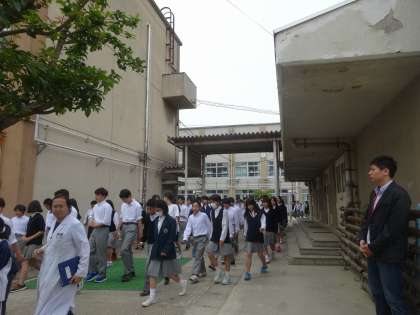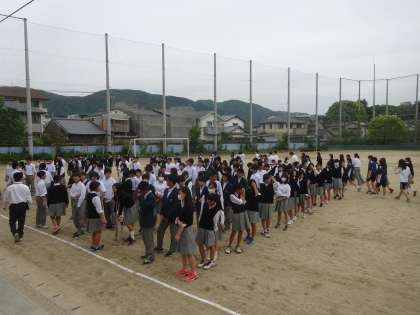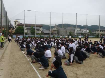 生徒たちは年度当初に示した避難経路に従って、迅速にグランドに避難しました。