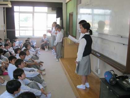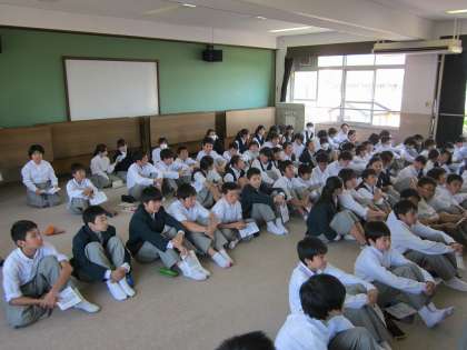いよいよ明日に迫った校外学習に向けて,学年集会を行っています。(3階 多目的室にて)