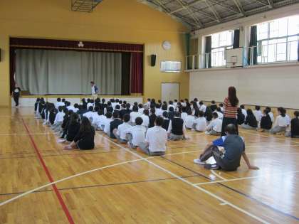 2年生は 体育館で学年集会。明日の校外学習に向けて。