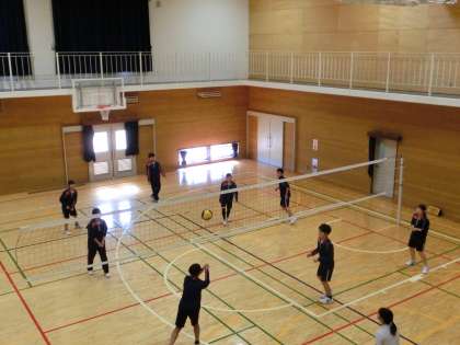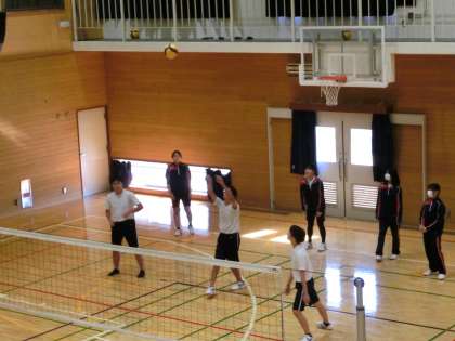 3年生の体育の授業では、バレーボールに取り組んでいます。今日は、チームで試合を行いましたが、男女共学の授業、男女混合チームでみんな仲良く楽しく授業に取り組んでいます。