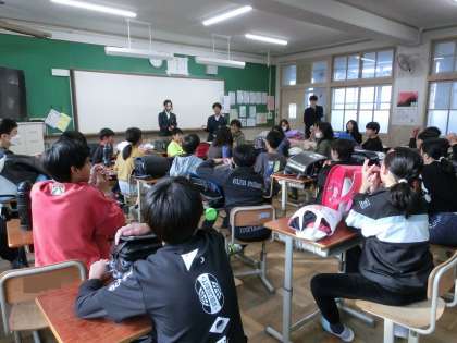 校門前でお出迎えをし、各小学校のクラス毎に教室に入って生徒会本部の生徒と少し活動をしてから、体育館で学校紹介を行いました。