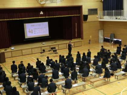 3年生では、私立高校の先生を講師にお迎えして、体育館で「面接マナー講座」を行いました。