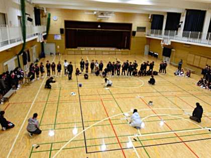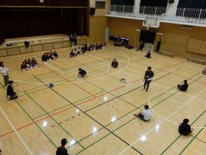 教員によるパス回しのデモンストレーションの後、クラス毎にパス回しの体験をしました。その後、各クラスの選抜メンバーによる試合をしました。