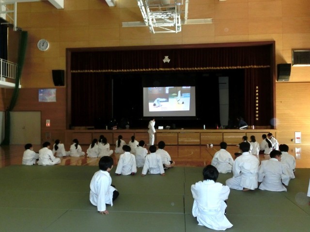 本時は、「受け身」について動画を視聴し、先生の示範・説明を受けた後、ペアで練習に取り組みました。