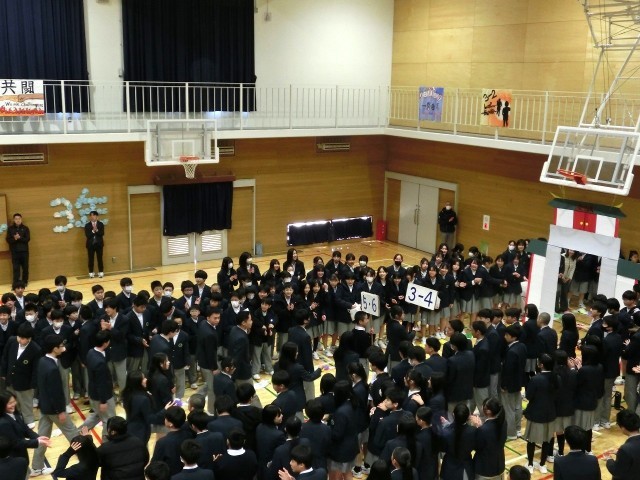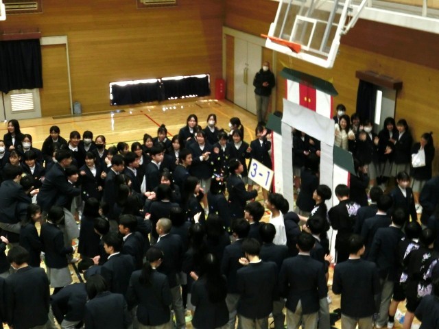 「3年生を送る会」の締めくくりは、3年生へのエールをこめて、生活委員長の掛け声での全校生徒・教職員による一本締め。