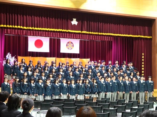 式後の卒業生からのメッセージと合唱は、保護者の方から顔が見えるように壇上に立って行いました。学年合唱「あなたへ」は、感動の涙を誘う心震えるものとなりました。