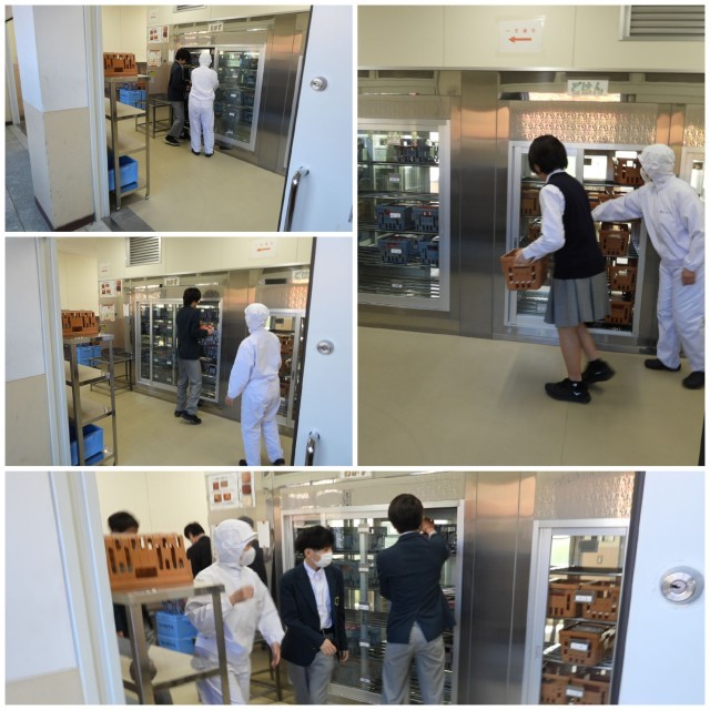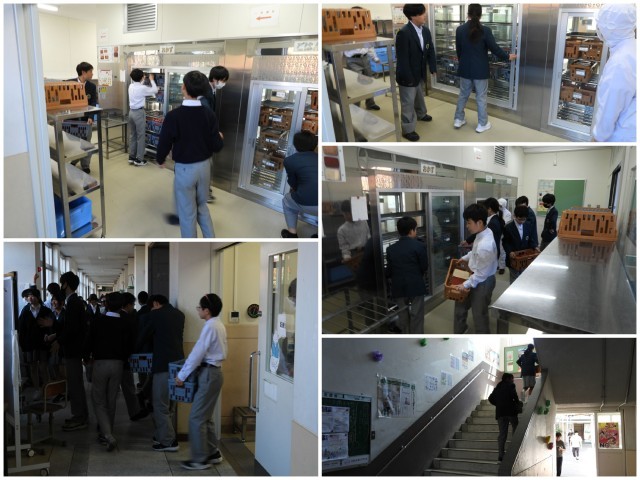 給食を注文している人たちで当番を決めて配膳室へ取りに行っています。